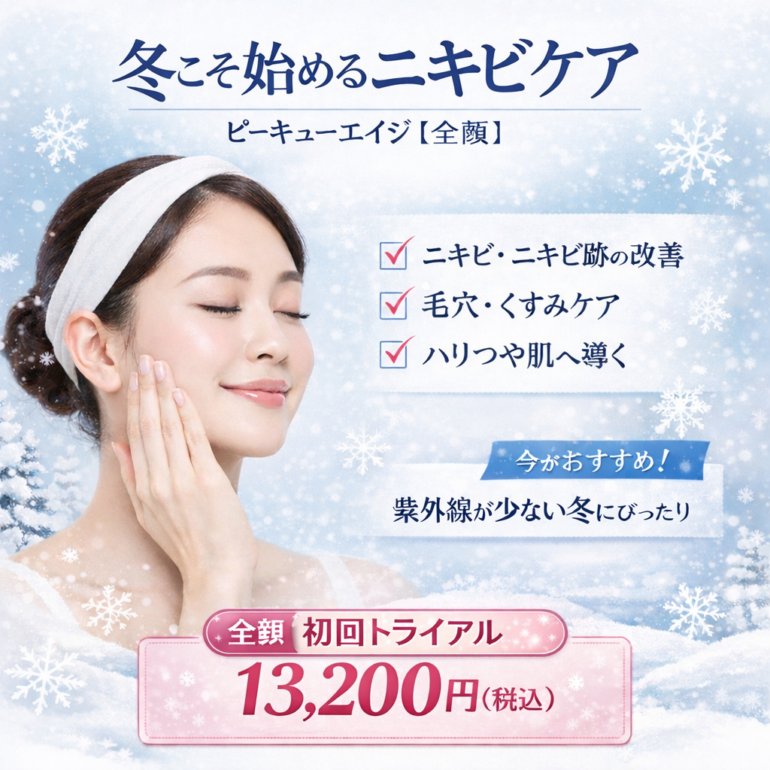寒暖差と乾燥が影響する今の季節こそ、ピーキューエイジでニキビに悩まない肌づくりを始めてみませんか?♬
